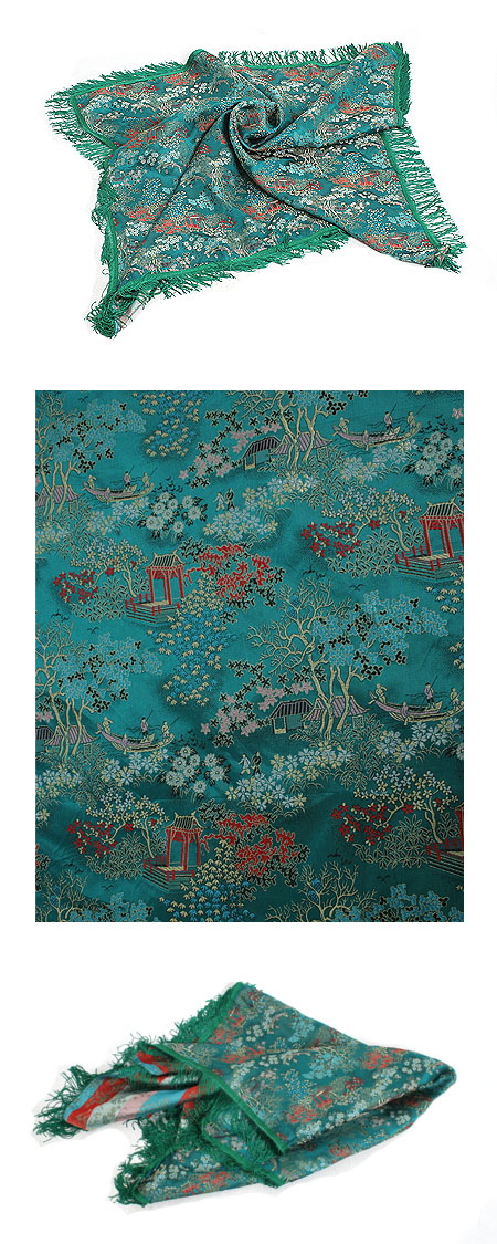 85*90 공단 느낌의 두툼한 천위에기계자수가 빼곡히 놓인 동양적인 테이블 보입니다.