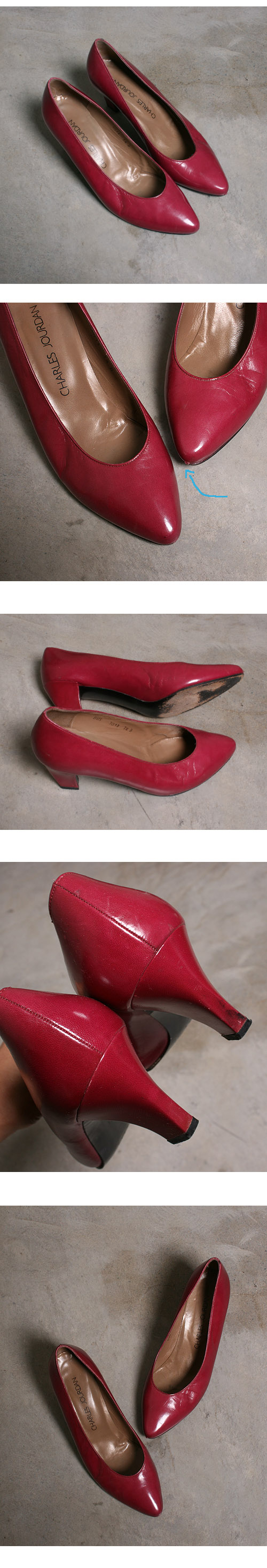한쪽 앞볼 가죽이 벗겨진 부분이 있습니다. 2번 화살표 표기 부분 확인 수선집에서 가죽을 붙여 조금 더 덜 표나는 상태입니다.