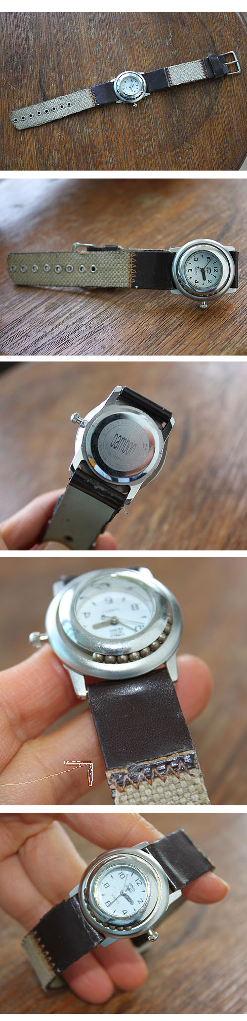 시계줄 때가 좀 탄상태입니다. 화살표 표시 부분 확인해주세요.착용엔 전혀 문제 없습니다.
