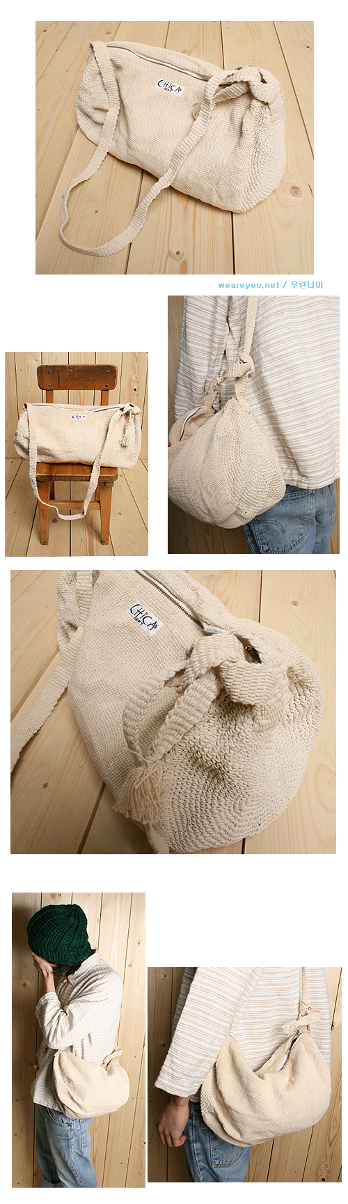 굵직한 짜임이 느껴지는 면사로 짜여진 가방입니다.